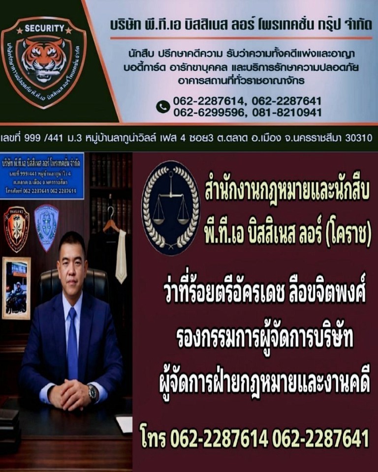 รับปรึกษาคดีความทั้งคดีแพ่งและคดีอาญา รับว่าความคดีแพ่งและคดีอาญา ทั่วโคราชและทั่วประเทศ บริการให้คำปรึกษากฎหมาย เขียนสัญญาหรือร่างสัญญาต่างๆ ฟ้องร้องดำเนินคดี เจรจาประนอมหนี้ ไกล่เกลี่ยข้อพิพาท โดยทีมทนายความมืออาชีพ บริการสืบทรัพย์ บังคับคดี ออกจดหมายโนติส หาหลักฐานเพื่อดำเนินคดี